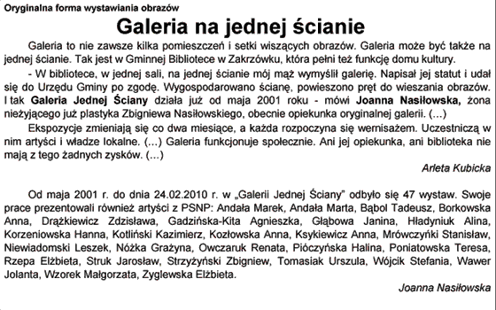 Od 2001 roku współpracuje z Gminną Biblioteką Publiczną w Zakrzówku, organizując wystawy w „Galerii Jednej Ściany”, zainicjowanej przez